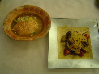 | →こちらは、蟹の甲羅がまるごと入った 卵とじのような料理と、松茸の揚げ物です。 |